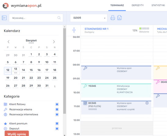 - Intuicyjny kalendarz rezerwacji, umożliwiający klientom wybór dogodnego terminu wizyty w serwisie poprzez aplikację mobilną kierowcy, stronę wymianaopon.pl, widgetu na stronie serwisu i profilu FB